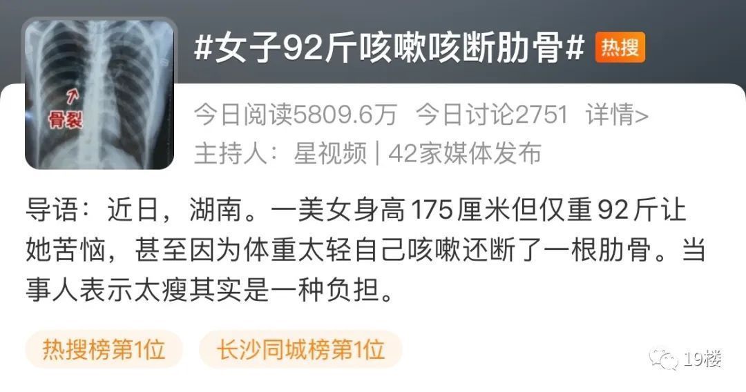 近日,湖南一美女就发文控诉自己的烦恼,这位女子身高175厘米,但体重却仅仅只有92斤,由于因为体重太轻导致自己咳嗽还曾断了一根肋骨。